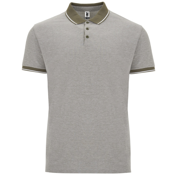 Polo Vigoré de manga corta. Cuello y bocamangas en color solido con canalé 1×1 y detalle decorativo a contraste. Tapeta interior con cinta decorativa a contraste y tres botones. Bajo con apertura lateral reforzada y cinta decorativa. Espalda ligeramente más larga que el delantero.